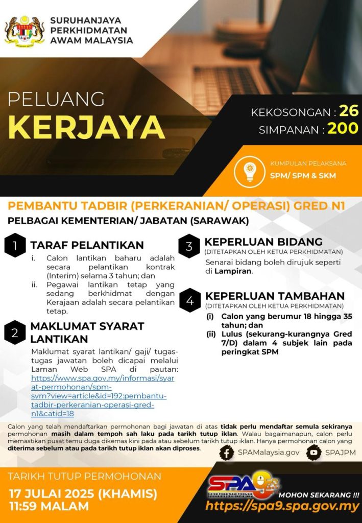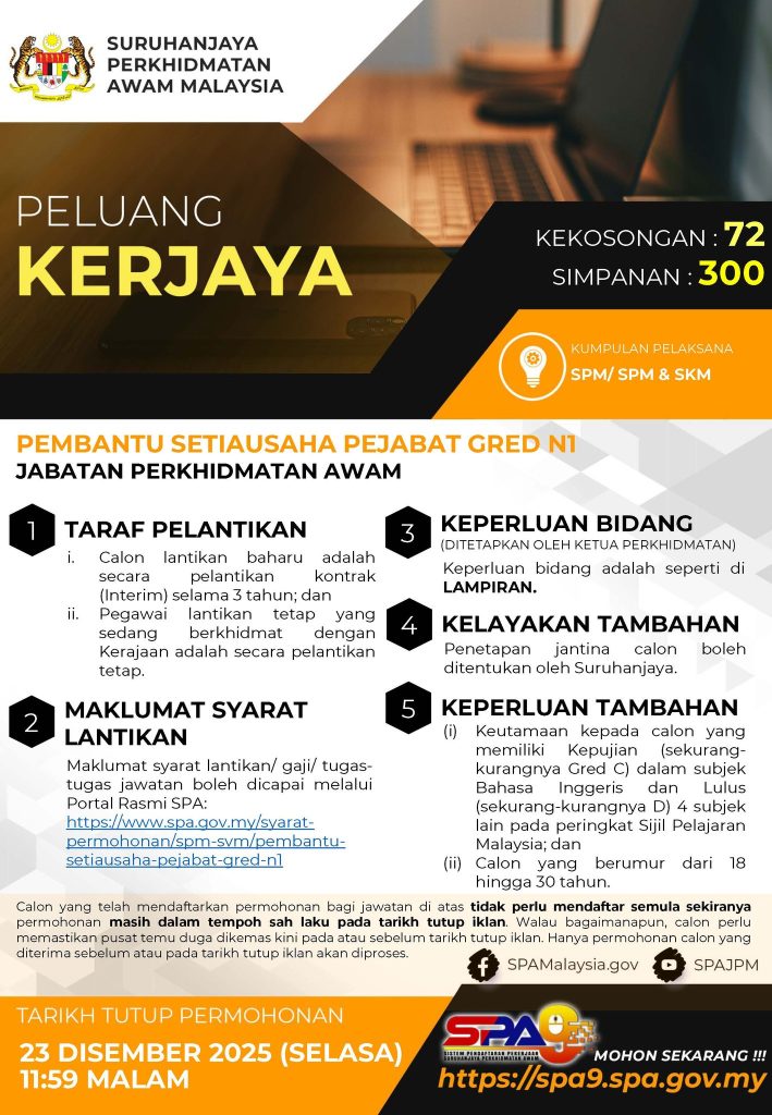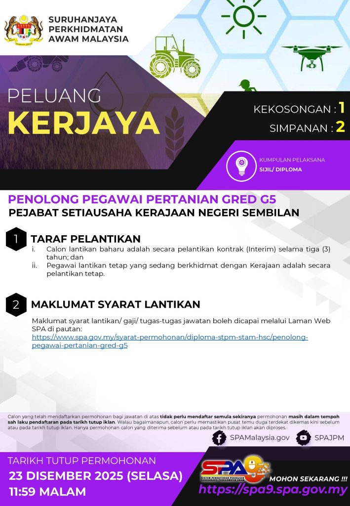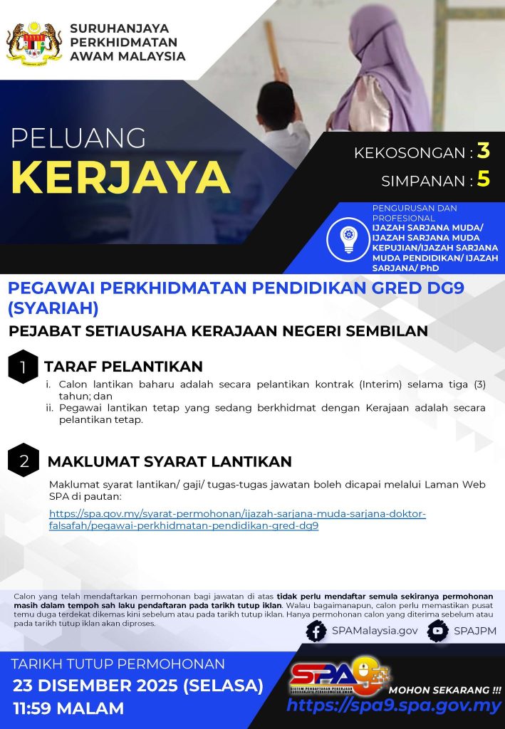 Suruhanjaya Perkhidmatan Awam Malaysia (SPA) mempelawa warganegara Malaysia yang berkelayakan untuk memohon jawatan Pegawai Perkhidmatan Pendidikan Gred DG9 (Sains dan Matematik) di bawah Pejabat Setiausaha Kerajaan Negeri Sembilan. Jawatan ini dibuka kepada calon profesional dalam bidang pendidikan, khususnya Sains dan Matematik. Maklumat Jawatan Taraf Pelantikan Calon lantikan baharu akan dilantik secara kontrak (Interim) selama tiga […]