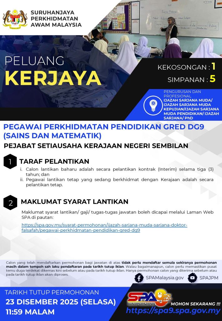 Iklan Jawatan Kosong Pegawai Perkhidmatn pendidikan Gred DG9 (Sains Dan Matematik)