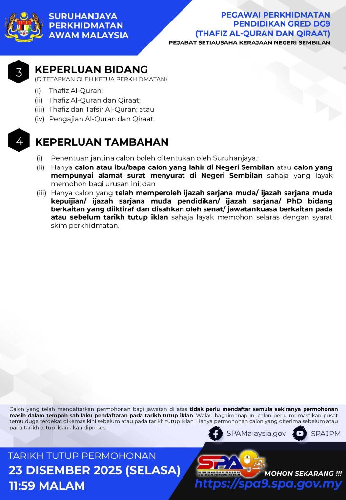 Suruhanjaya Perkhidmatan Awam Malaysia (SPA) mempelawa warganegara Malaysia yang berkelayakan untuk memohon jawatan Pegawai Perkhidmatan Pendidikan Gred DG9 (Thafiz Al-Quran dan Qiraat) di Pejabat Setiausaha Kerajaan Negeri Sembilan.