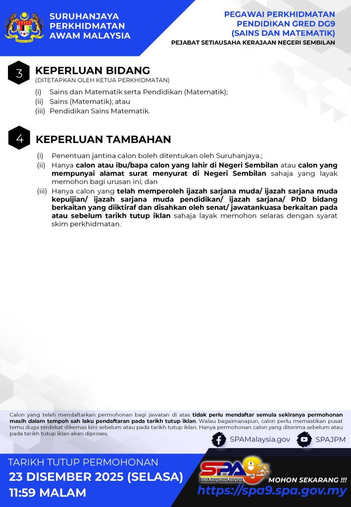Suruhanjaya Perkhidmatan Awam Malaysia (SPA) mempelawa warganegara Malaysia yang berkelayakan untuk memohon jawatan Pegawai Perkhidmatan Pendidikan Gred DG9 (Sains dan Matematik) di bawah Pejabat Setiausaha Kerajaan Negeri Sembilan. Jawatan ini dibuka kepada calon profesional dalam bidang pendidikan, khususnya Sains dan Matematik.