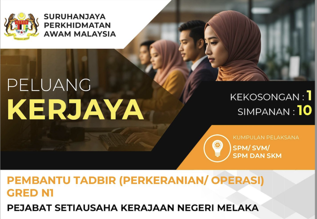 Suruhanjaya Perkhidmatan Awam (SPA) Malaysia kini membuka peluang kerjaya bagi warganegara Malaysia yang berkelayakan untuk mengisi kekosongan di Pejabat Setiausaha Kerajaan Negeri Melaka.