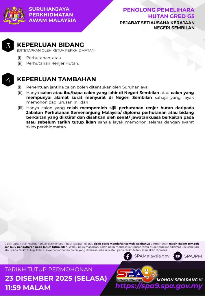 Suruhanjaya Perkhidmatan Awam Malaysia (SPA) mempelawa warganegara Malaysia yang berkelayakan untuk memohon jawatan Penolong Pemelihara Hutan Gred G5 di bawah Pejabat Setiausaha Kerajaan Negeri Sembilan. Jawatan ini sesuai bagi calon yang berminat dalam bidang perhutanan serta pemuliharaan sumber alam.
