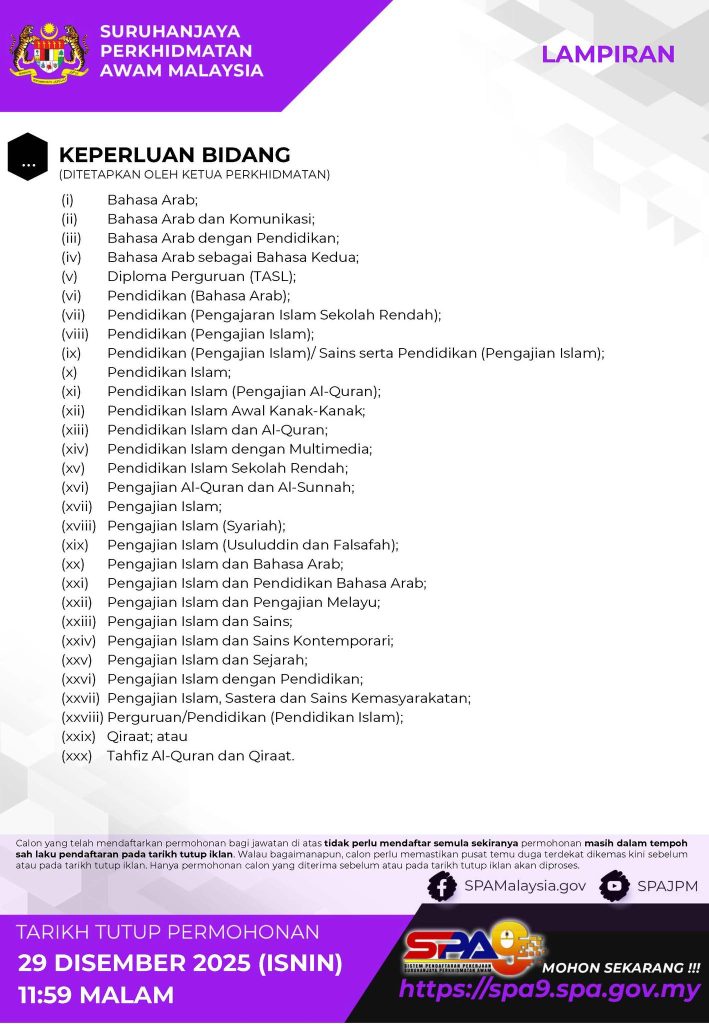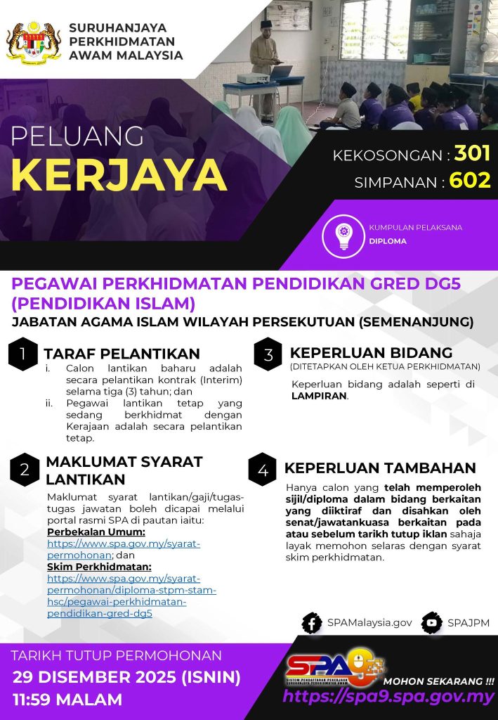 Suruhanjaya Perkhidmatan Awam Malaysia (SPA) mempelawa warganegara Malaysia yang berkelayakan untuk memohon jawatan Pegawai Perkhidmatan Pendidikan Gred DG5 (Pendidikan Islam) di bawah Jabatan Agama Islam Wilayah Persekutuan (Semenanjung). Jawatan ini terbuka kepada calon lepasan diploma dalam bidang pendidikan dan pengajian Islam yang berkaitan.